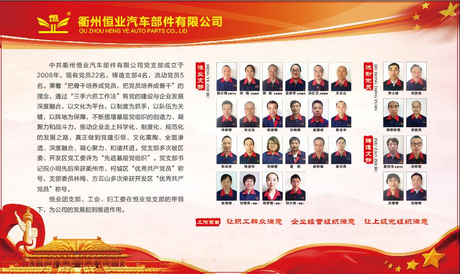 中共衢州恒業(yè)汽衢州恒業(yè)汽車(chē)部件有限公司黨支部成立于2008年,現(xiàn)有黨員24名,鑄造支部4名,流動(dòng)黨員5名。秉著“把骨干培養(yǎng)成黨員,把黨員培養(yǎng)成骨干”的理念,通過(guò)“三手六爪工作法”將黨的建設(shè)與企業(yè)發(fā)展深度融合,以文化為平臺(tái),以制度為抓手,以隊(duì)伍為關(guān)鍵,以陣地為保障,不斷提增基層黨組織的創(chuàng)造力、凝聚力和戰(zhàn)斗力,推動(dòng)企業(yè)走上科學(xué)化、制度化、規(guī)范化的發(fā)展之路,真正做到黨建引領(lǐng)、文化熏陶、全面滲透、深度融合、凝心聚力、和諧共進(jìn)。黨支部多次被區(qū)委、開(kāi)發(fā)區(qū)黨工委評(píng)為“先進(jìn)基層黨組織”。黨支部書(shū)記祝小明榮獲衢州市、柯城區(qū)“優(yōu)秀黨務(wù)工作者”稱(chēng)號(hào),支部委員林梅、方云山、錢(qián)金松、蔣俊等榮獲開(kāi)發(fā)區(qū)“優(yōu)秀共產(chǎn)黨員”稱(chēng)號(hào)。黨員徐財(cái)?shù)隆⒆3鐒偠啻潍@得市級(jí)職業(yè)技能大賽優(yōu)異成績(jī),恒業(yè)的技師團(tuán)隊(duì)也全部來(lái)自支部黨員。